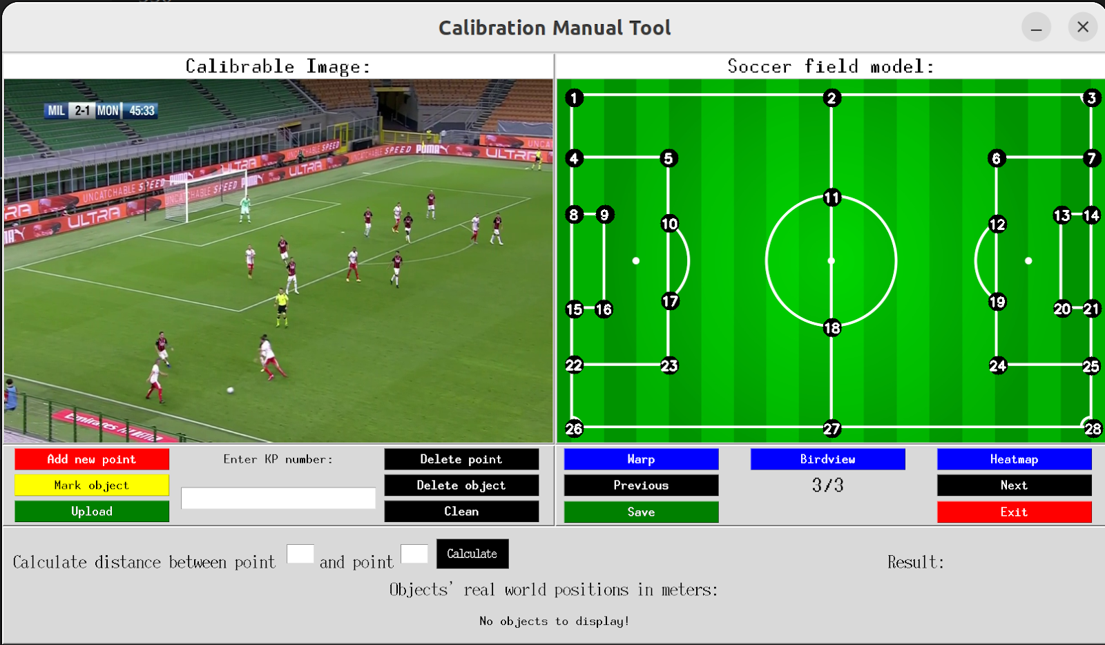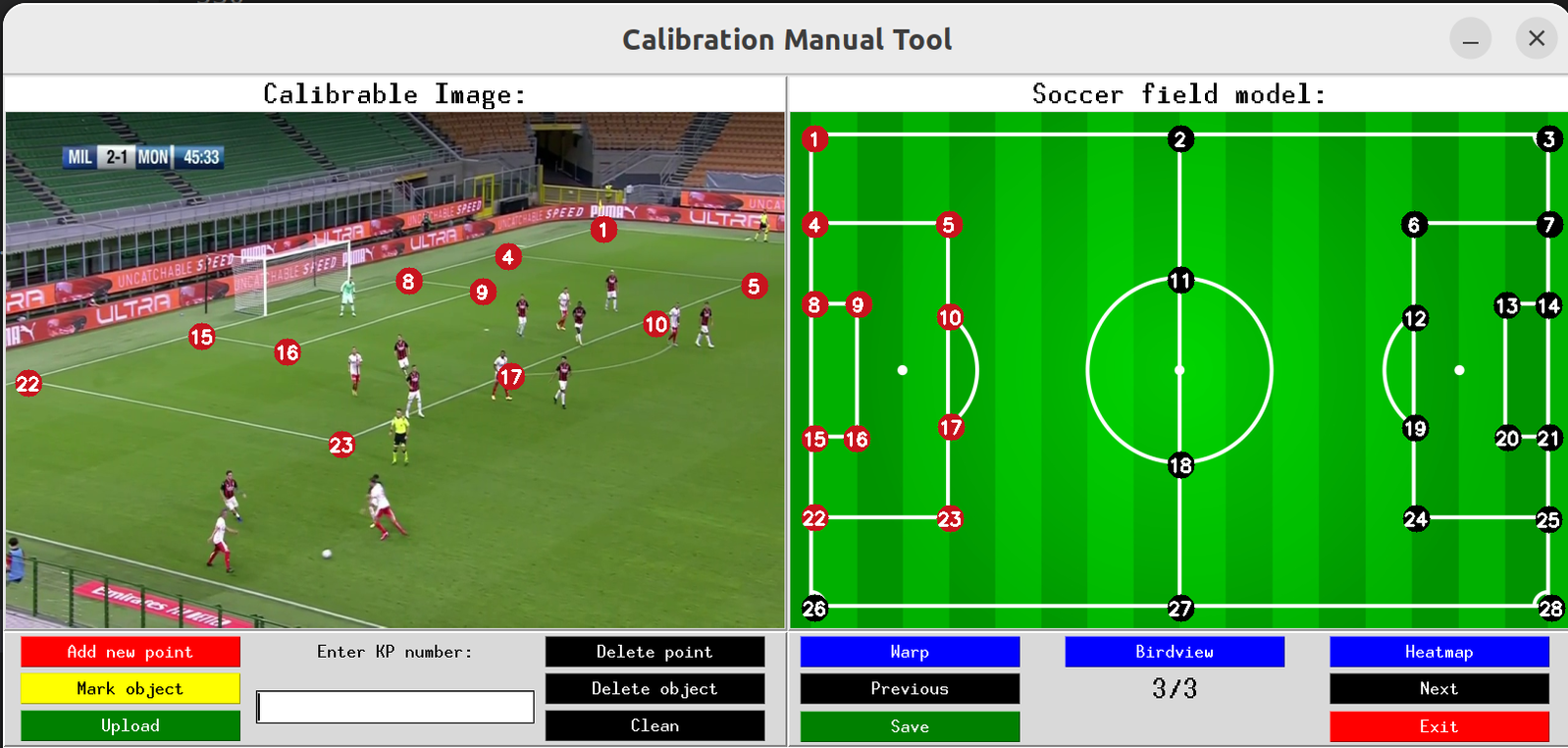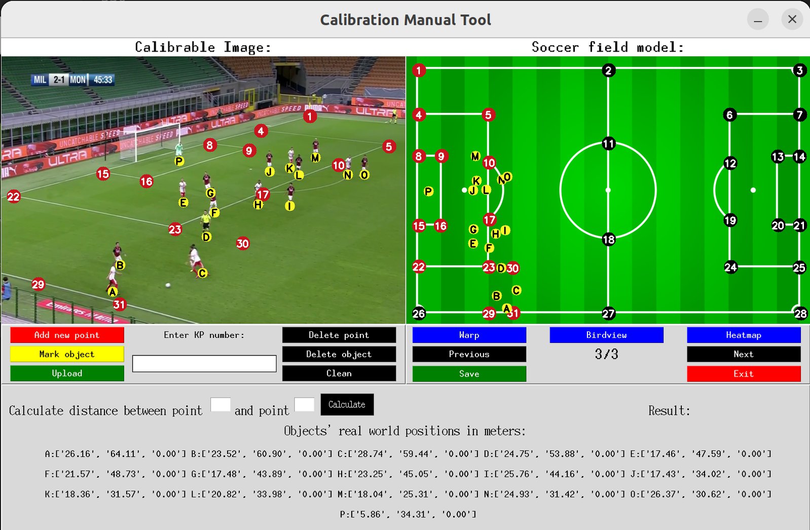 Not only is the Manual Tool able to obtain the homography matrix, but it also allows the position and computing of distances among players, from 2D pixel to 3D real-world coordinates. Moreover, it also outputs the warped image, its bird view projection, and a heatmap of the players.