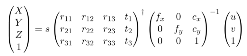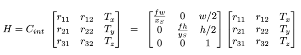 The homography matrix obtained from combining the camera’s extrinsic and intrinsic parameters is the product of both matrices without the third column of the extrinsic matrix (Figure 5). Removing that third column can be done as the planar Z is 0, considering only points in the same plane XY, also known as coplanar points.