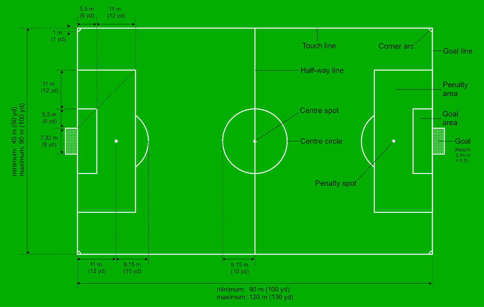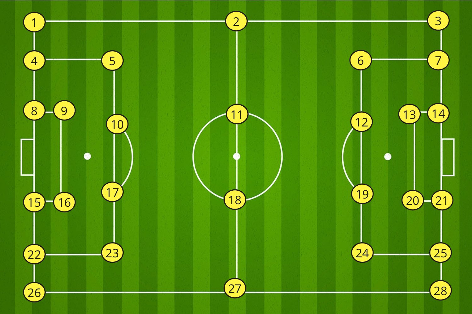 This tool requires Soccer field dimensions for distance reference, as not all the fields have the exact dimensions (Figure 7). Matching key points between the reference map and the real image, to ease the identification and increase the accuracy, have been reduced to 28 key points corresponding to the field lines’ intersection points (Figure 8).