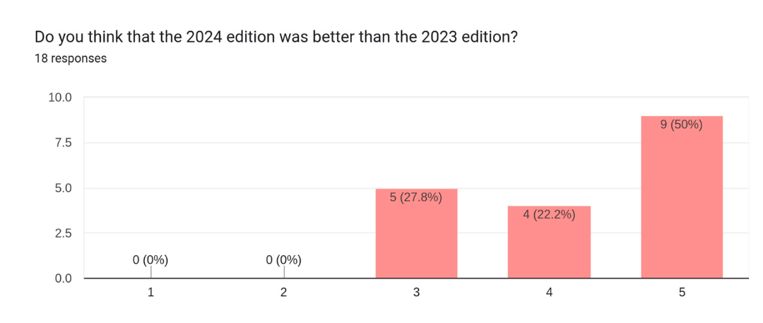 This drop gave us pause, as it seemed to suggest that the 2024 edition hadn’t met participant expectations as well as the previous year. But then, something interesting emerged: when we asked attendees directly whether the 2024 edition was better than 2023, the feedback was overwhelmingly positive.