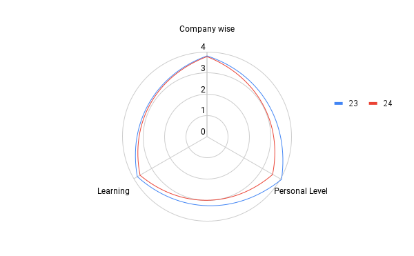 The survey results initially seemed a bit surprising. When we examined specific categories such as Company Impact, Personal Impact, and Learning, we noticed slight declines compared to 2023—especially in the Personal Impact category.