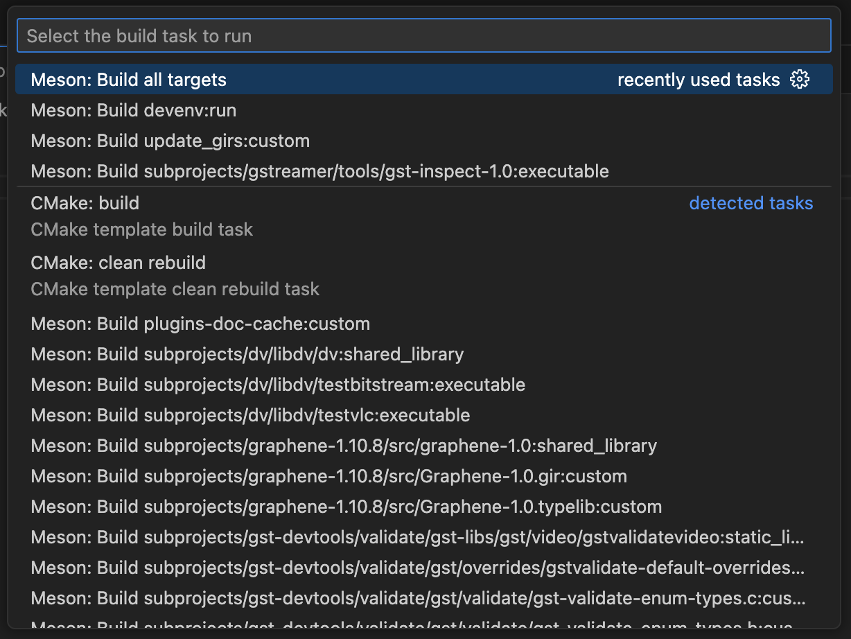 The Meson extension provides a task to build all the targets and one task for each target to build them individually. They can be launched with the Meson: Build task, which opens a dropdown menu with all the available Meson build tasks.