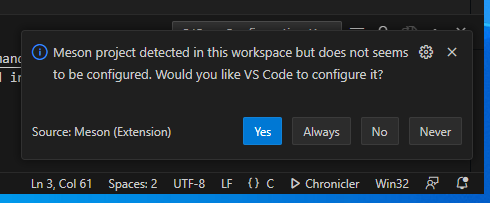 With the Meson extension installed, the first time you open a Meson project, VScode will ask you if you want to configure it with the following options: