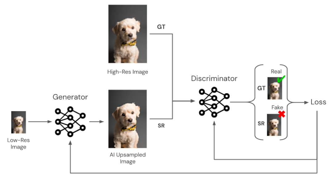 The GAN-based architecture in our plugin features two interconnected neural networks: the generator and the discriminator. The generator creates high-resolution images from low-resolution inputs, while the discriminator differentiates between the original high-resolution images (GT) and those produced by the generator.