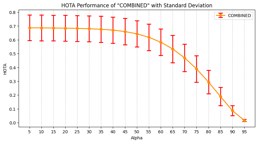 As shown in Figure 4, our tracking algorithm exhibits solid performance, maintaining a HOTA score close to 0.7, suggesting good accuracy in detecting and associating objects in video sequences. The error bars, representing the standard deviation, provide a view of the variability and consistency of the tracker’s performance across different sequences.