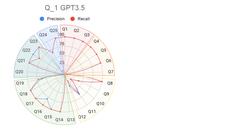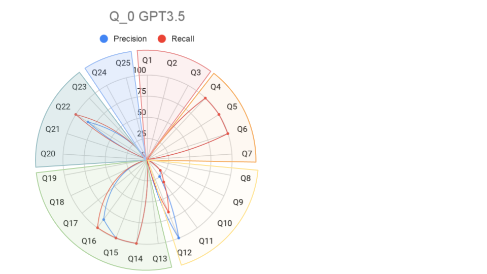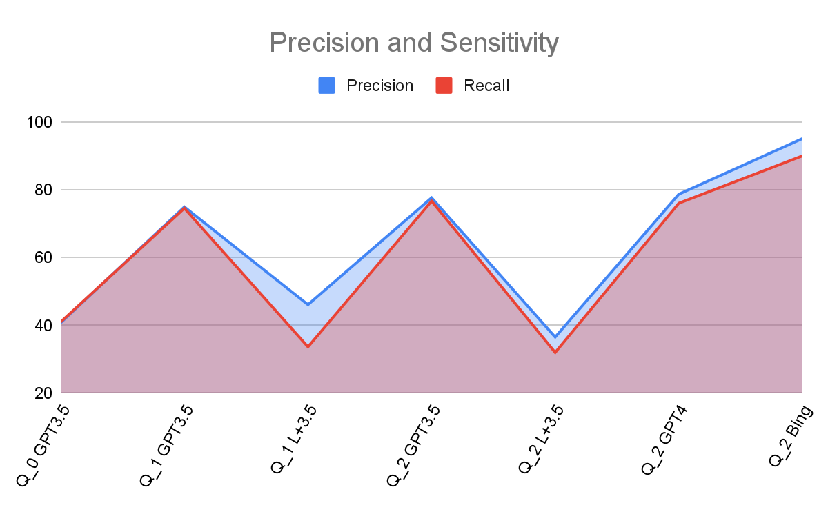 The results using the ChatGPT 3.5 model were illuminating. A marked uptick in both precision and recall was observed, with metrics soaring from an initial average of around 40% to over 70%.